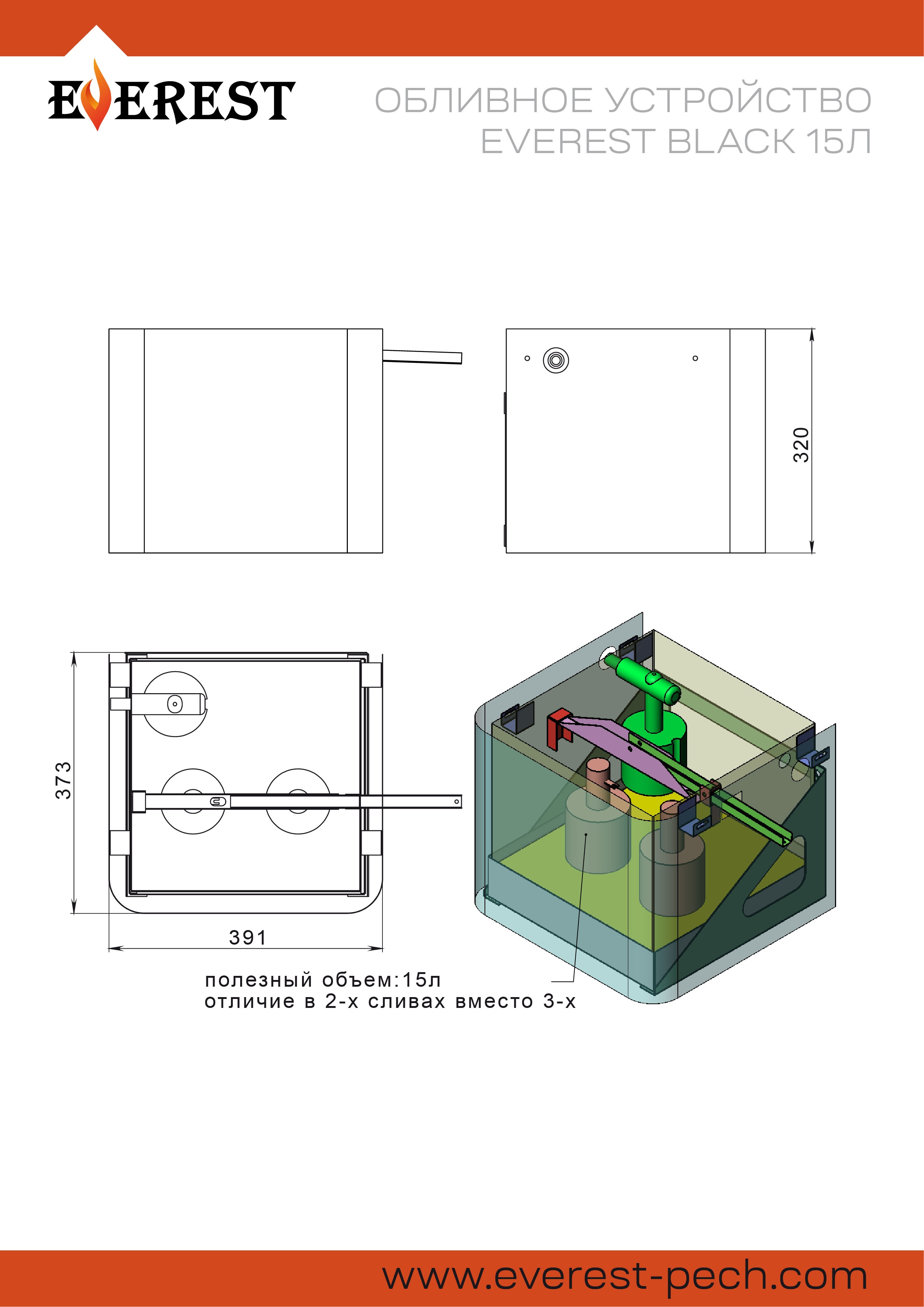 Обливное устройство ЭВЕРЕСТ представляет собой бак из нержавеющей стали, автоматически наполняемый водой. Количество воды в баке регулируется с помощью клапана подачи воды. Максимальный объём воды в баке – 15 литров. Бак обливного устройства устанавливается на высоте 2-2,2 метра. Вода для облива после парилки подаётся с помощью рукоятки на цепи. Широкое основание бака с большим количеством мелких отверстий обеспечивает оптимальный по размеру и интенсивности поток воды. Равномерная подача большого объёма воды обеспечена за счёт трех выпускных клапанов, одновременно открывающихся при потягивании рукоятки вниз.