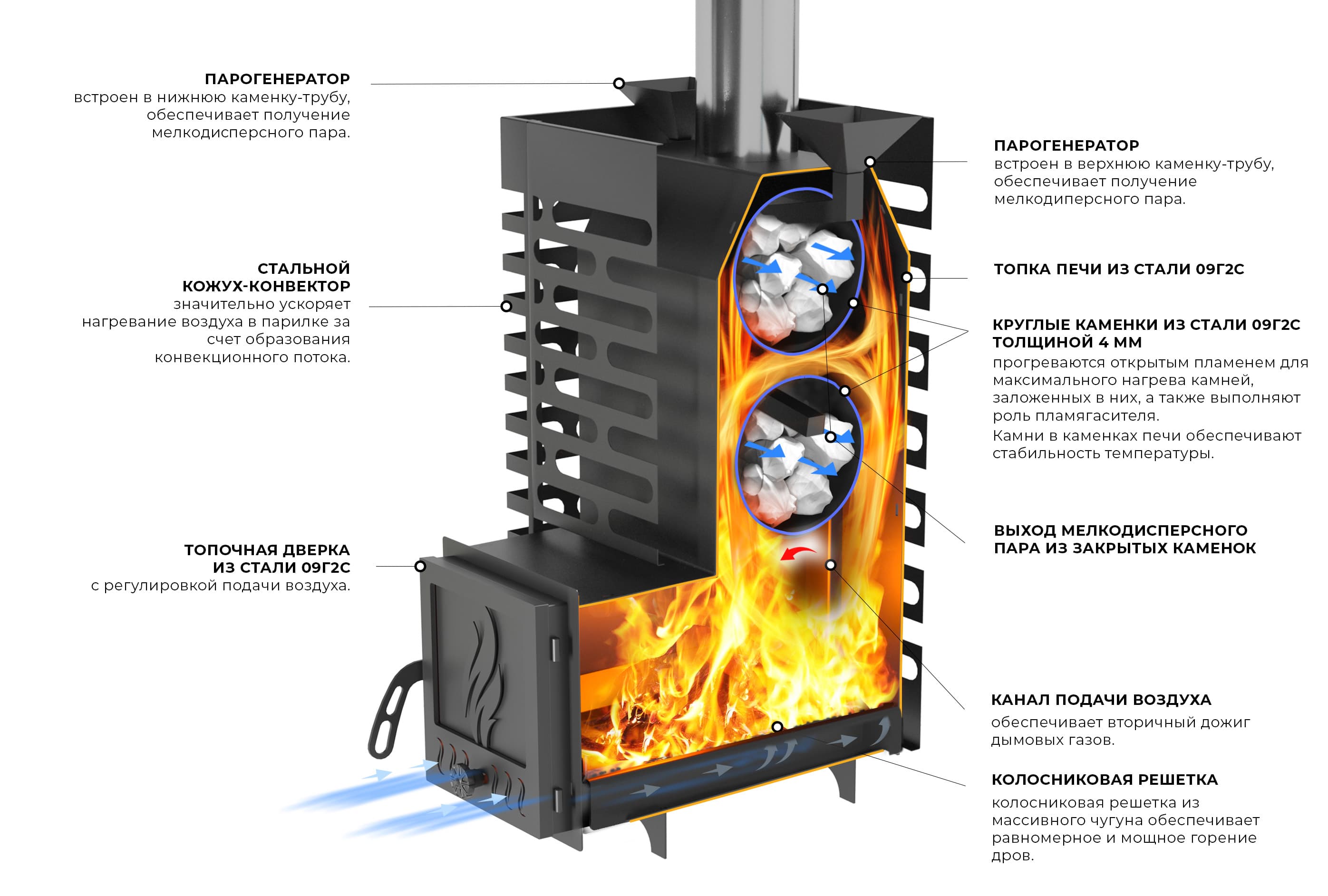 Глубокая невентилируемая каменка-труба из стали 09Г2С толщиной 4 мм прогревается открытым пламенем для максимального нагрева камней, заложенных в нее и выполняет роль пламегасителя.