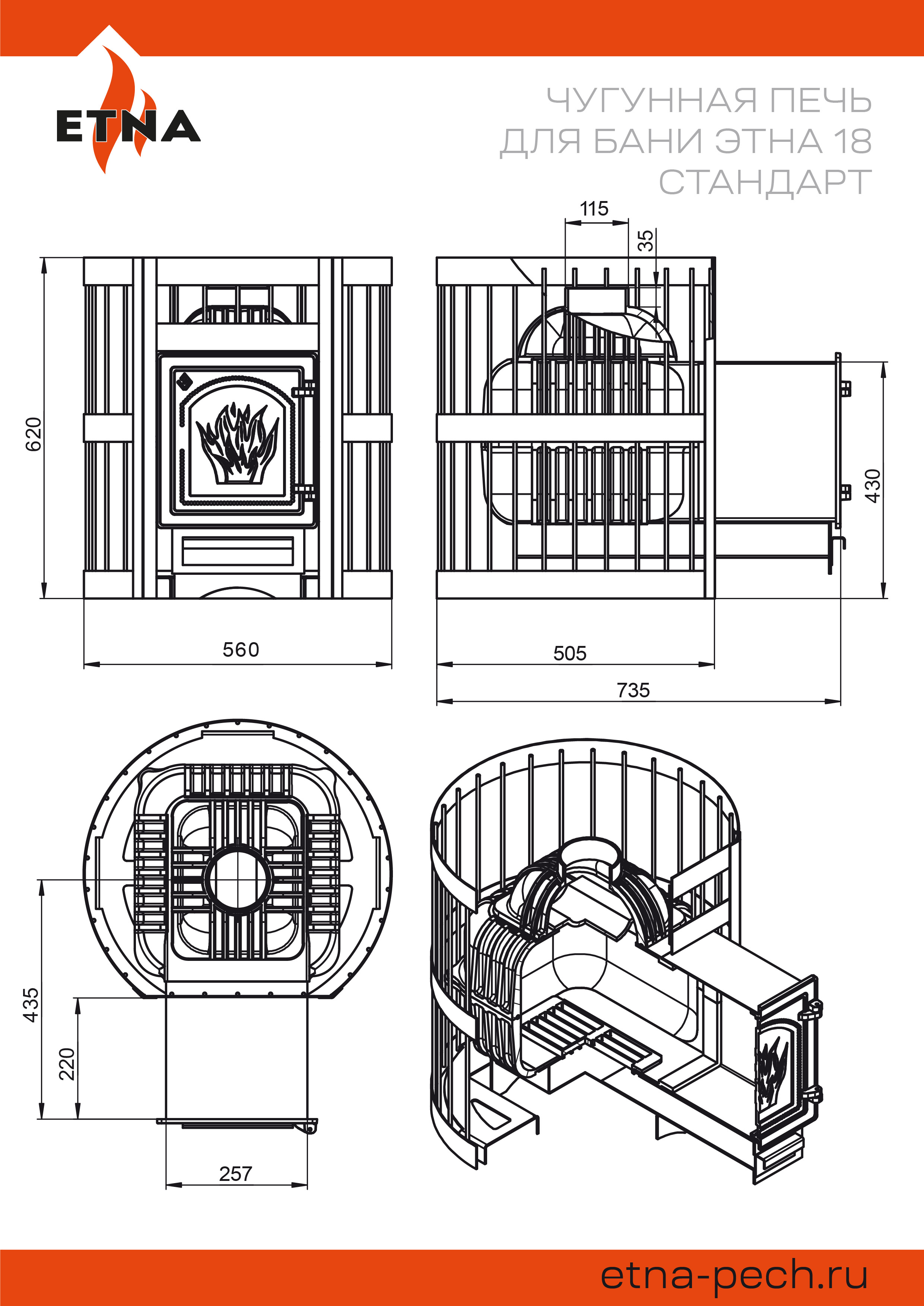 Банная печь ЭТНА 18 ДТ-4 изготовлена из чугуна высокого качества. Материал с высокой теплопроводностью, чугун быстро передаёт энергию сжигаемого топлива наружу, в пространство парной. Толщина деталей корпуса составляет 6-8 миллиметров.