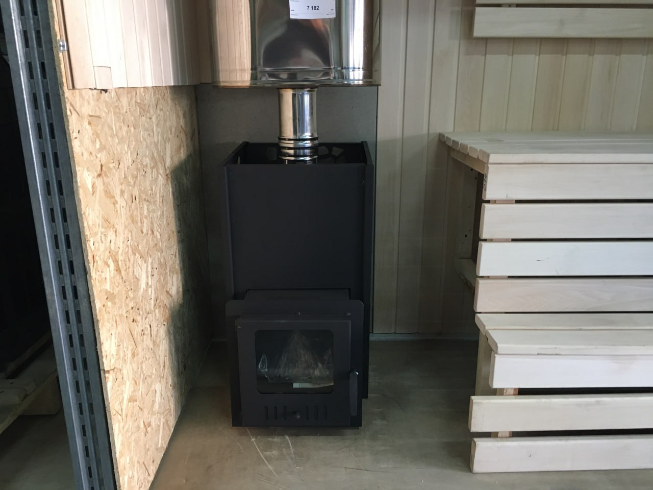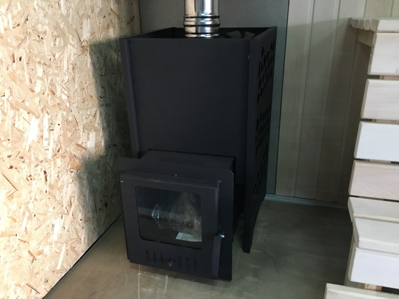 Разборная металлическая облицовка выполняет функцию конвекционного кожуха, создающего круговой конвекционный поток и способствующего быстрому нагреву парной.