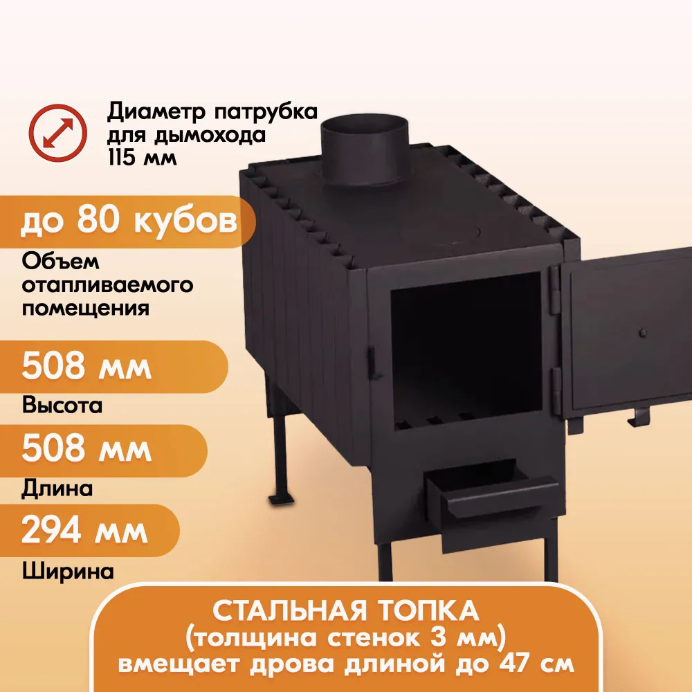 Отопительная дровяная печь Буржуйка PECHITEPLOV (ПЕЧИТЕПЛОВ) 80Б с конфоркой, зольником и конвекционными стенками, печка для дачи, гаража, в теплицу