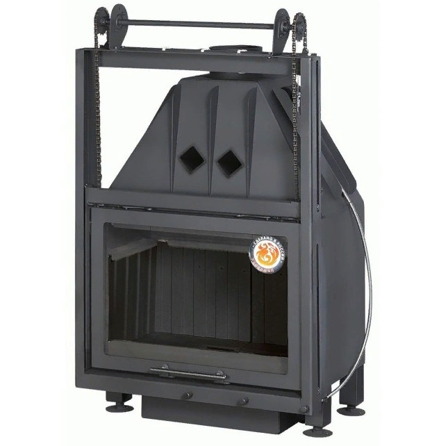 У этой модели дверь для закладки дров открывается вверх. Подъем двери легкий. Практически без усилий. Достигается это за счет противовеса, разгружающего вес двери.