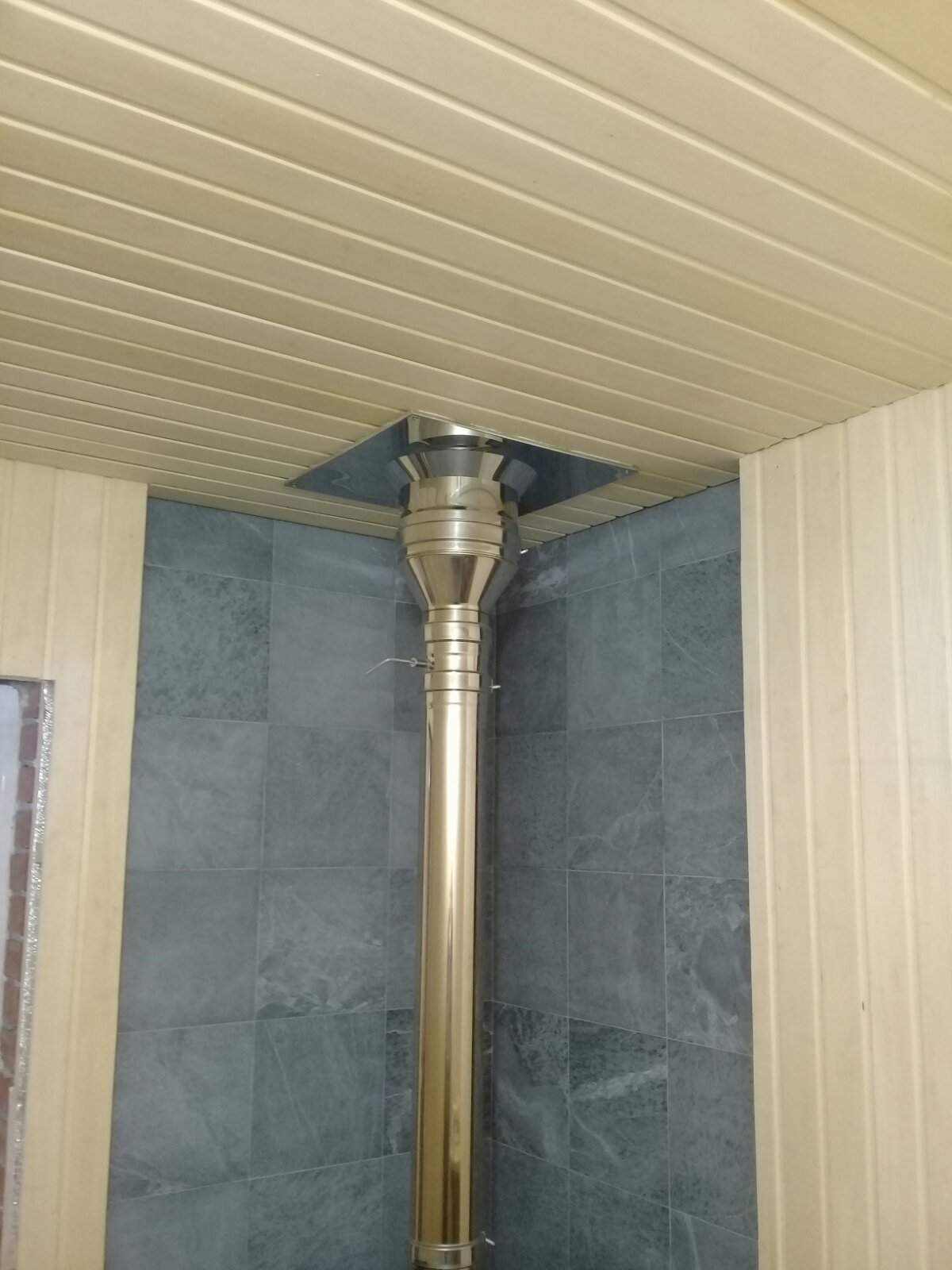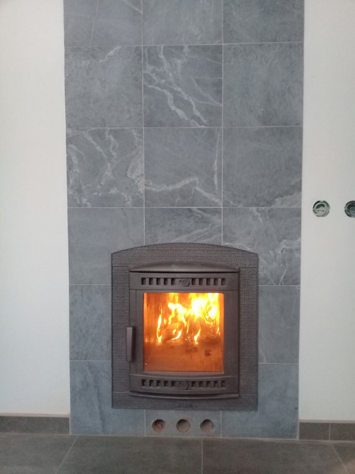 Монтаж печи Атмосфера с установкой дымохода и портала их натуральной каменной плитки со стороны комнаты отдыха